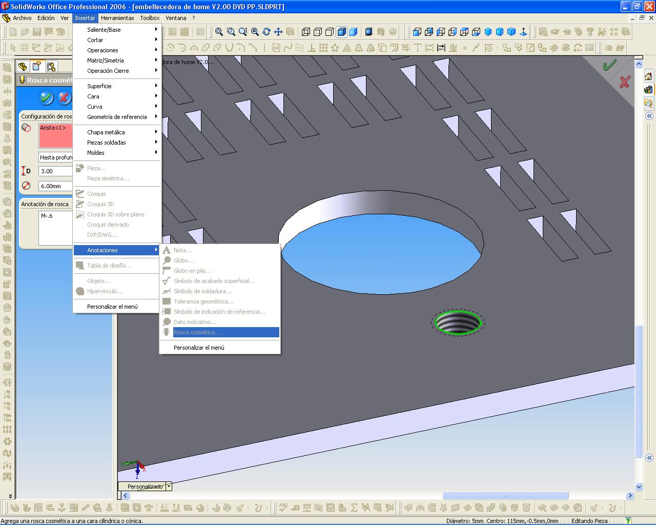 Con el filete y la hélice aparte que es un trabajo de perros, imagina que tienes 80 agujeros con rosca, ¿te imaginas que trabajo? Por no decirte los recursos que chuparía.Duda de Solidworks. Tengo que representar una rosca (macho) en un eje, ¿tiene SolidWorks una orden para hacerlo directamente, algo, así como el taladrado, o hay que extruir el perfil (filete) a través de una hélice? Gracias y saludos.
