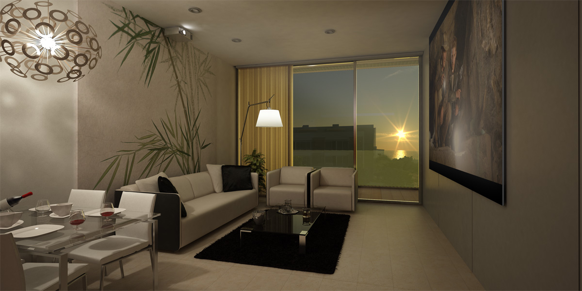 Hola jacinto, buen trabajo tío, me gusta el tipo de arquitectura y la iluminación, solamente hay un par de cosas que me llaman la atención, por ejemplo, los downlights, creo que son demasiado grandes, no digo por el diámetro si no porque sobresalen de la pared una barbaridad, además creo que no están texturizados, en esa imagen la parte dónde está la pantalla del proyector si te das cuenta esta como vacía, se ve mucha decoración en la zona izquierda de la escena y en la derecha casi no se ve nada, a lo mejor si pones algún mueble bajo o algo así podrías evitar esa sensación, en la segunda imagen si te das cuenta las luces de los downlights se escapan por el techo, mira a ver si es un fallo de geometría o de subdivisiones y la tercera está muy bien, lo único que decirte es esos cojines que parecen estirados, se ven raros y que si te das cuenta tienes reflejando el cielo azul en todos los cromados, y hay algunas cosas que cantan un poco, por ejemplo, la mesa de salón.