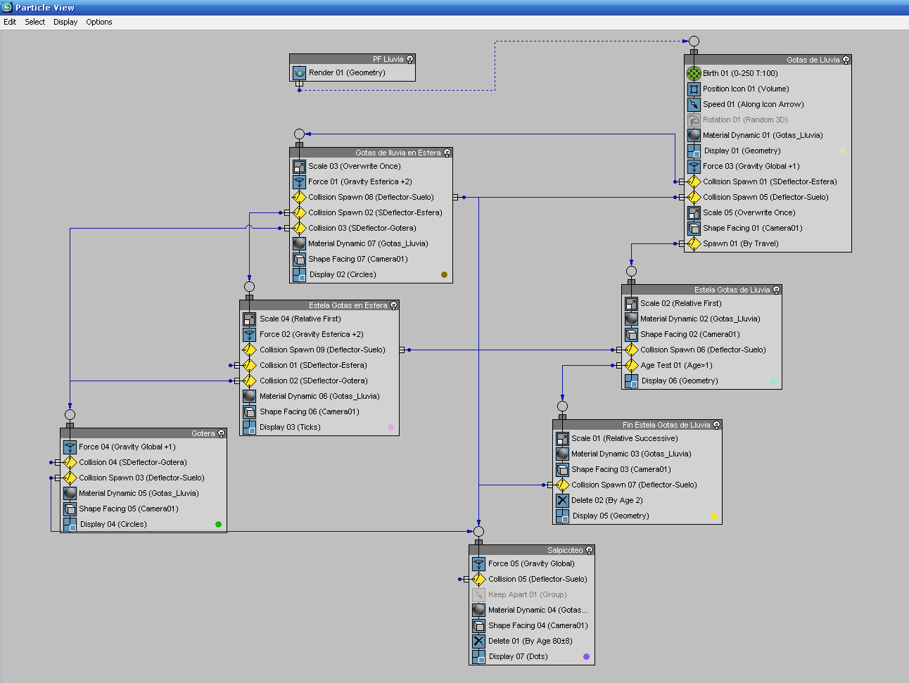 Noche de lluvia. Yo personalmente pediría la colaboración del amigo gsus, para que, si no es mucho trabajo confeccionara un tutorial completo sobre Particle Flow, en el que se expusieran todos los matices que no aparecen en los tutoriales tan malos y superficiales que hay en la red(videotutoriales que se ven mal, el púto inglés o incompletos en cuanto a lo superficiales que son y bastante básicos. No se explican la aplicación de materiales y mensaje producción, en fin, algo más serio, pero en español.