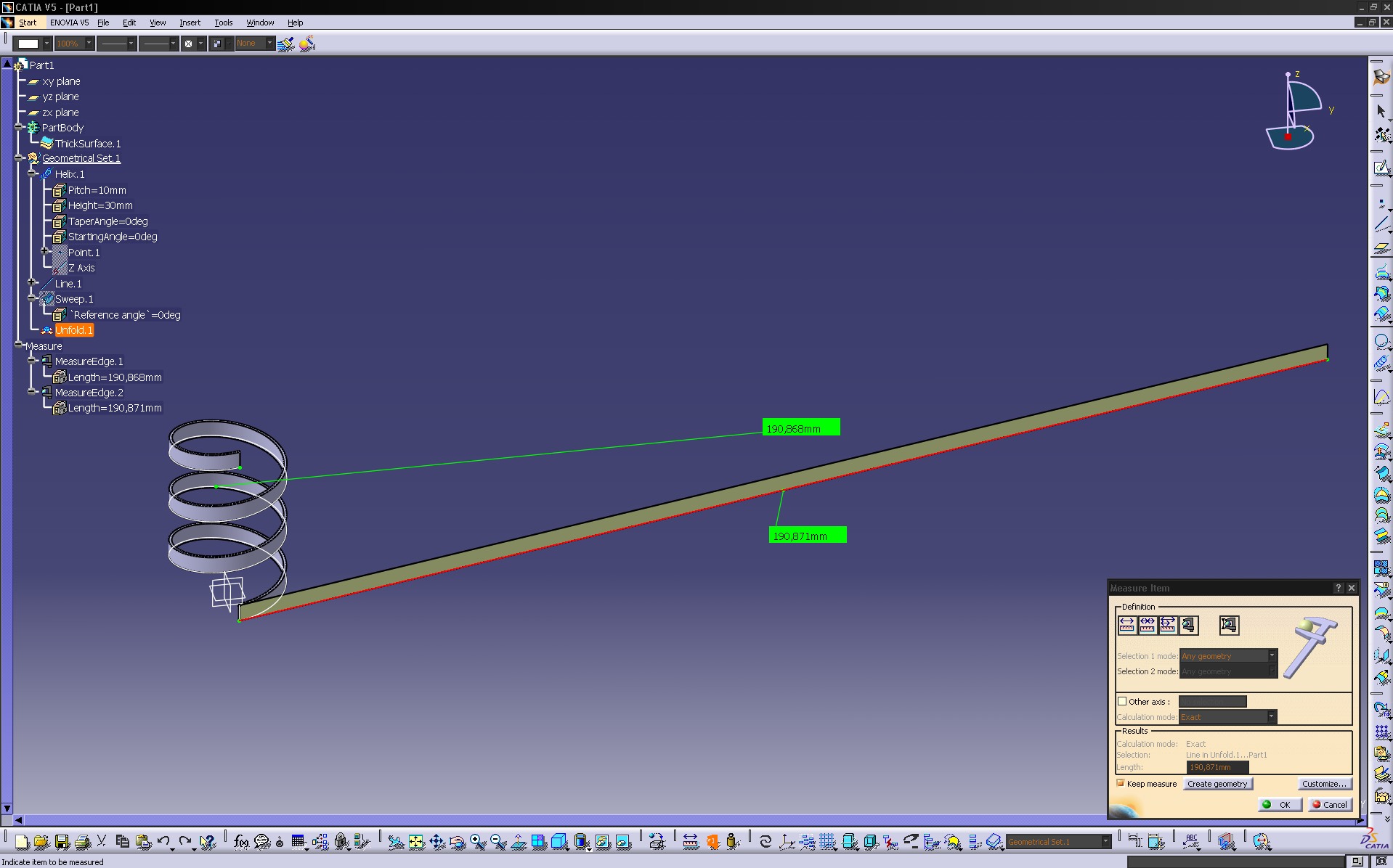 Otra posibilidad. ¿Has mirado si las herramientas de medición de Solid Edge, te devuelven un valor length? Si es así deberías poder seleccionar un Edge o la curva guía de la hélice y devolverte su longitud. A malas, busca la fórmula del helicoide para calcular su longitud manualmente.