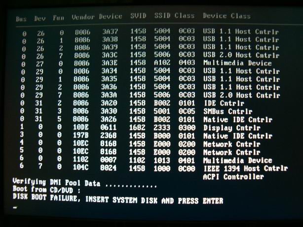 Boot from CD/DVD: disk boot failure, insert disk and press enter. Y de ahí no sale, le das al intro y te vuelve a salir lo del boot from CD/DVD.