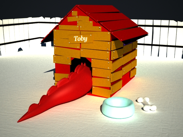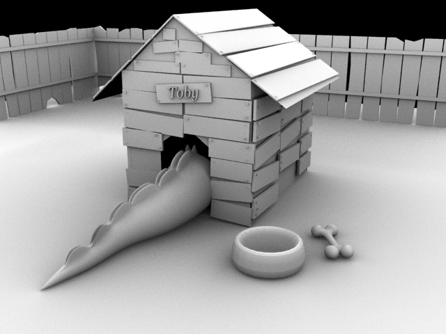 Hola a todos, esta tarde de viernes me aburría en casa así que, me he puesto a modelar una idea que me ha surgido de repente (supongo que, basada en el capítulo de los Simpson en el que se les mete un tejón en la caseta del perro). Me he puesto a modelar y he sacado esto. El problema viene ahora, no sé qué tipo de texturas darle, como enfocarlo. Realista lo he descartado después de hacer una prueba con madera, no me gusta para este tipo de escena. Por ahora lo he dejado con un fallof en el mapa de reflexión al 40% pero tampoco me convence mucho, lo veo demasiado, repetitivo. Os dejo el AO de la imagen y la prueba del fallof.