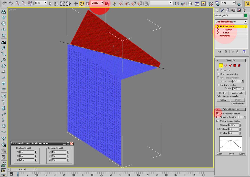 Posdata: luego usaría optimizar, multires o algo para quitar los vértices innecesarios fuera de las dobleces. Usa geometría con una sola cara.