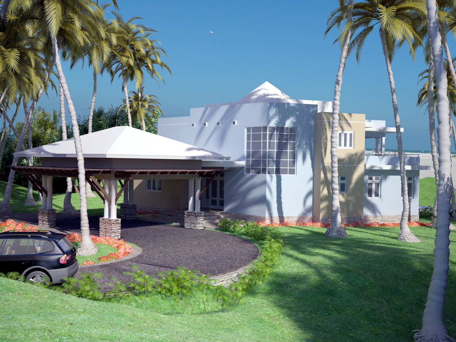 Hola max, que tal, buen curro las dos imágenes, pero hay algunas cosas que con poco tiempo podrían de dedicación podrían darle un poco más de realismo a la escena, en la primera la verdad es que hay alguna geometría que no da sombra, por ejemplo, las 4 ventanas pequeñas que hay sobre la cubierta de entrada, se ven raras, también la imagen esta como un poco lavada, se ve muy blanca, no tiene mucho contraste, y sobre todo las palmeras, esas palmeras con los troncos tan blancos dan un poco el cante, intenta cambiarles la textura y veas como gana un poco más.