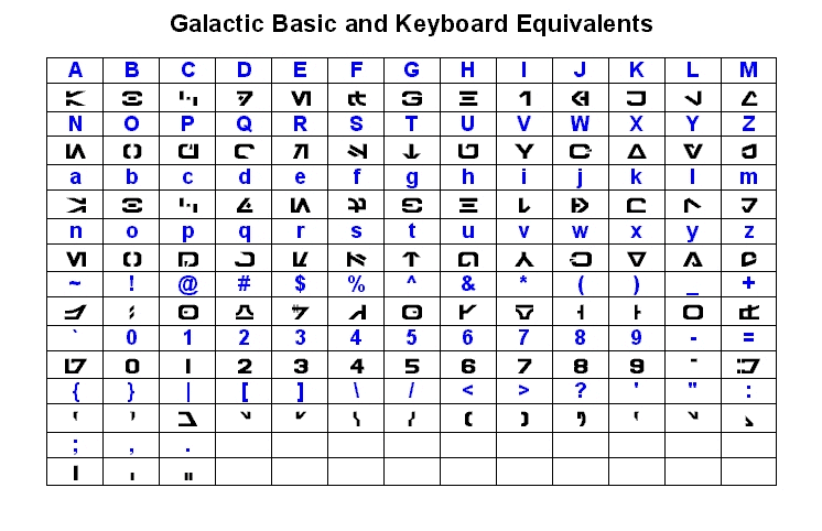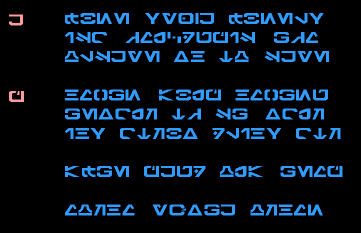 Esto también es por que los personajes Sheen (sh) y Thesh (º) - Se muestra en la gráfica proporcionada anteriormente por Alliante - No aparecen en la gráfica NewTek. No están incorporados en esta fuente.al parecer esta página trata de descifrar el código, adjunto algunas imágenes, en su web hay más información.Esta fuente se basa en Aurebesh - Pero difiere ligeramente de - Las letras creadas por el west end games (Aurebesh ver el alfabeto aquí). mi atención se ha centrado con precisión poblar esta fuente con letras que se ven sólo en episodio vi - El retorno del Jedi y Episodio I - El ataque de los clones. After close examination of screenshots and oficially available información, Many letters have ben revised or replaced. después de un examen de capturas de pantalla y oficialmente la información disponible, muchas cartas se han revisado o sustituido. (if youre interested in an in-depth Analysis of Aurebesh and roj screenshots, se my editorial what does that screen say? ) (si está interesado en un análisis en profundidad de Aurebesh y roj capturas de pantalla, ver a mi editorial de la pantalla, ¿Qué dicen?).