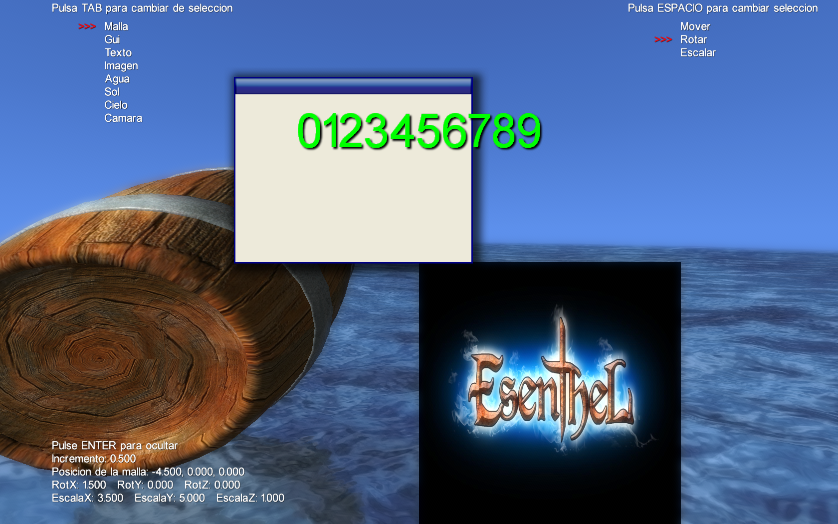 También he incluido el código de un ejercicio en Esenthel donde podremos colocar en pantalla los diversos elemento del juego, incluso modificando sus parámetros, y así conocer las coordenadas o configuración necesarios. Algunas imágenes. Saludos.