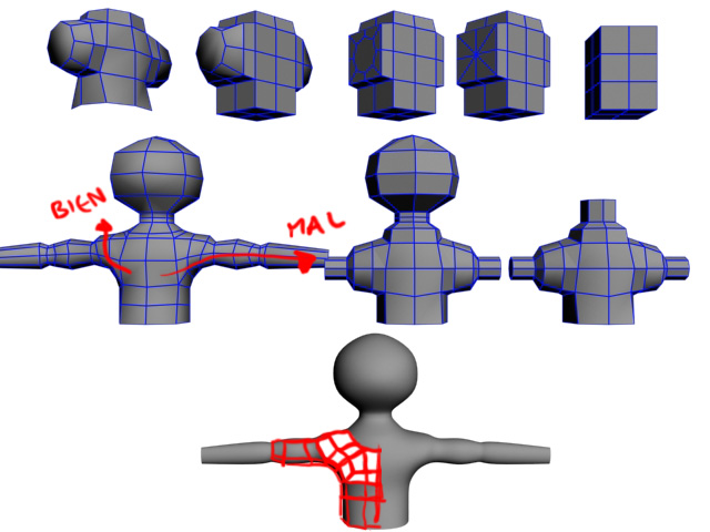 No obstante, sí puedes hacer que tú personaje tenga una distribución de los polígonos en los hombros como la que presentas, pero tienes que darle aún muchas vueltas y redondear zonas. Porque digo yo que te estarás basando en algún personaje o usando hojas de modelo para modelar, ¿no? Si no es así, es lo que deberías hacer antes que hacerlo de cabeza.