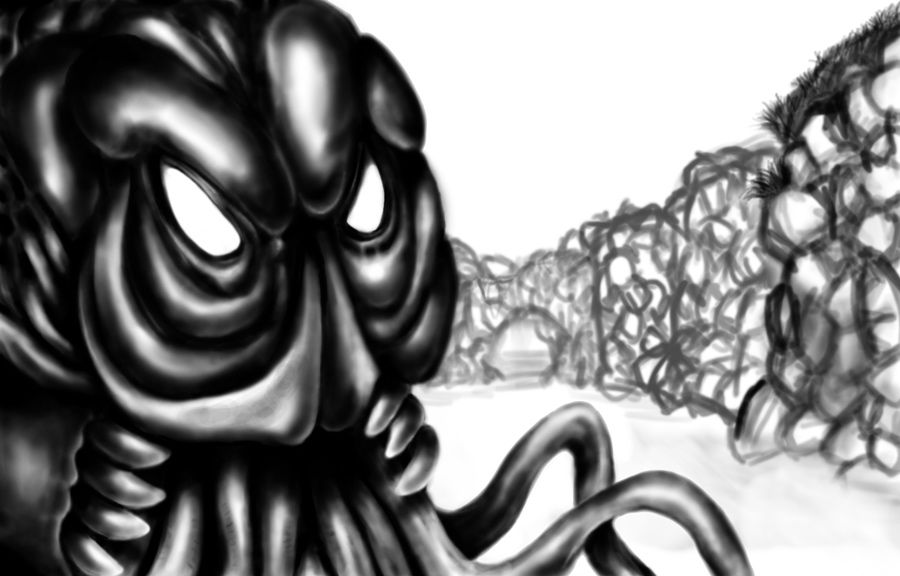 El dibujo lo estoy tomando más bien como un ejercicio practico, para pillarle el puntillo a la tableta, por eso hay tanto volumen por aquí y por, allá y el bicho en cuestión es un poco caótico (no hice ni bocetos, fue todo sobre la marcha). Además, como podéis ver no está terminado, ya que esos garabatos del fondo no son definitivos, los puse para hacerme una idea de cómo quedarían unos acantilados (cualquier otra sugerencia será bienvenida).