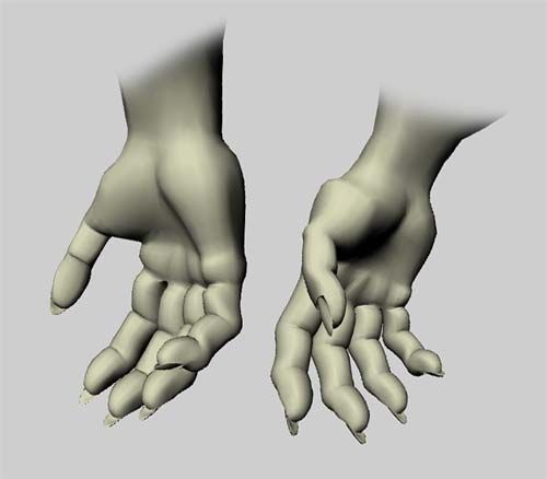 En especial el dedo gordo lo modelas siguiendo el plano de la mano y esta es una postura francamente incómoda. Si miras tu propia mano derecha veras que aproximadamente el dedo gordo (en postura descansada) esta marcando un doble ángulo de 45 grados hacia la izquierda y 45 grados hacia abajo.