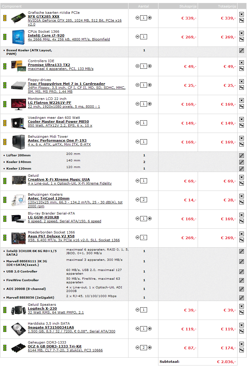 Hola Wayfa. Acabo de estar en la página de alternate de hola tras ver tu lista para ver si algo se puede mejorar. Primero la caja Asus ta-982 que has seleccionado no creo que es buena idea (teniendo que la tarjeta gráfica es potente y seguro que se calienta)acabo de ver las características de la caja. En la página en las especificaciones te dicen que se pueden poner 2 ventiladores de 120mm(ojo opcionales)osea que ni los lleva. También si no lo he leído mal pone que hay sitio para 12 ventiladores, pero tras ver fotografías de la caja por Google yo no veo nada de esto y parece que en realidad solo lleva un ventilador de 80 milímetros atrás donde debería estar el de 120 y fin. Si no me equivocó la caja solo lleva un pequeño ventilador con poca opción para poner más. La caja más barata con las mejores prestaciones que tienen en esta página es la cooler master haf932 de 129 euros. Es cierto que es algo más cara, pero me fije en el resto de los componentes de cómo se puede reducir el dinero para que se equilibra el precio. Primero esta fuente de 1000w es buena, pero si no tienes intención de montar un SLI con otra GTX 285 creo que es innecesaria. Si este es el caso puedes elegirte la Corsair cmpsu-850tx que vale 135EUR que es de 850w. Lo de la RAM. Para que funccione, por ejemplo, a 1600 esto depende de las latencias y creo que debería poner algo como cl8 o cl9 pero creo que con 1331 Mhz funcionará bien. Te recomiendo esta Ram OCZ 6 Gb DR3-1333 Tri-Kit que te costara 4EUR más y es a 1331 Mhz y te dejo el enlace de la página porque con tanta Ram puesta hay se encuentra difícil http://www.alternate.nl/html/pcbuild...cn=1#Tech Data lo que me hace confuso es el precio de la placa base. Yo la estoy viendo en la misma página que tú con el mismo precio, pero pone que es la placa base+procesador e8500+4 Gb de RAM. No sé si lo que tú estas viendo es solo el precio de la placa base o es un pack entero de varias cosas. Vuelvo un poco a la torre que te recomendé. Si te decides por ella te recomiendo que le compres un ventilador de 120 milímetros de 2000rpm para ponerlo dentro y así la completas. Suerte con la compra tío.