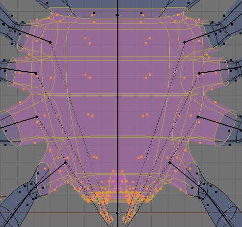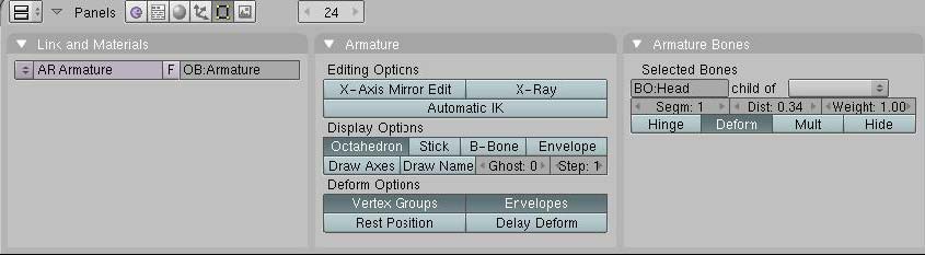One last thing, with all the newly extruded Bones selected, go into the editbutton -> armature Bones panel and toggle all deform buttons of (one for each bone). Do the same for the root bone and the abdomen bone, since they Will not move any vértices at all.