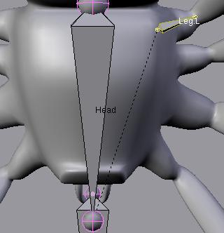 We Will now Rig the 8 legs. Dont worry, there is a bien todo do just half the job. Since the Spider is symmetrical, its posible todo tell Blender todo Rig the other half while we do our part. Go into the editbutton panel and toggle x-axis mirror edit. Go into side view [3numpad] select abdomen and duplicate it using [shift-d]. This Will give you an other bone with the same parent as abdomen, head. Move it todo one of the left legs so its placed where a leg is plugged todo the body and the tip is in the middle of the first Joint. Rename it todo leg. L: