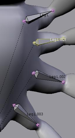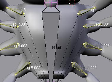 Now when you select the Rig and go in pose-mode [Control-tab], moving a bone should move something of the Spider. But in general its going todo be far from perfecto. This is where we start tweak envelopes. Go bak into the editbutton, in the armature panel, there Will be a envelope toggle. Turning it on Will let you se and tweak those envelopes. Basically they define an área for each bone where the geometry Will follow the bone. Changing the área todo better match what we want is done by selecting a bone and scaling the zone with [alt-s]. Its a los posible todo tweak envelopes in editmode of the armature (by pressing [tab]) and there is generally more options, like scaling the tip or root ball. At first the envelopes look like this: