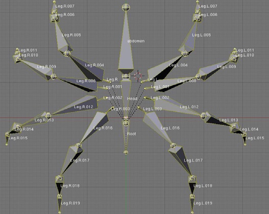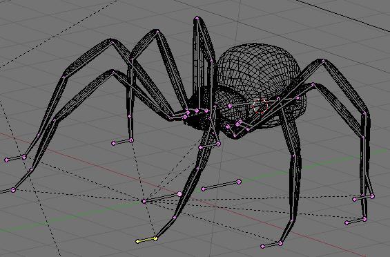 The result should let you postura this Little Spider in an easier way. You only ned todo move one of the IK targets todo move a leg. you can a los move the head and all the legs Will move accordingly. Its posible todo raise the flor or move the root. According todo this, we can hide all the useless Bones. Select all Bones you dont ned when animating and press [h] the result should be like this: