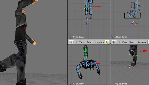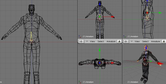 Next, make sure the cursor is centred on the pelvic área of joe from the front and side views. [spacebar] add >> armature. This is going todo create a new armature or bone system for our Mesh joe. you should have something very similar todo the image.