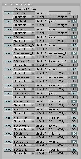 Ok, now that the basic Layout for the skeletal system is complete it is time todo parent certain Bones todo others and name each bone. While still in Edit Mode for the Bones press [f9] todo get todo the Edit Mode buttons (if you were not already there). Lok for armature Bones >> selected Bones in the buttons window. Make sure todo select all Bones [a]. To make it easier todo explain, match your bone names and parents todo the image below. Note, that a typical naming convention is todo add _r or _l todo either right or left Bones respectively.