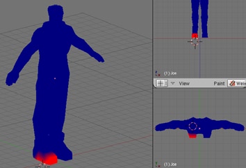 In rare instances, you Will not have todo change the selected vértices that were chosen when you selected create from closest Bones. In most cases you Will have todo at least select or remove some vértices from the vertex group. Other times, it is best todo erase all selected Bones by painting over the selected vértices with a weight of zero and full opacity. As said before, weight painting can be a bit of an art. Chosing which vértices belong and which do not can be dificult at times. Select the bone you would like todo begin weight painting under enlaces and materiales >> vertex groups in the buttons window view. To Paint the influence or weight value, [LMB] over the Mesh in the 3d view. As you Paint over your Mesh, you Will notice the vértices being coloured either red, green, blue, or a colour thereof based on the weight value under Paint in the buttons window view. These colours indicate the influence the bone has on the vertex. For most applications, painting in red sems todo be suficient enough--you may find otherwise. Lastly, concerning weight painting (or vertex groups in general), you may come across what is known as pinching or where todo Many vértices are attached todo Many Bones creating todo much deformation. Se below.