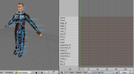 We finally arrive todo the fun part--pose mode or the actual animating. Select the armature with the [RMB] and enter what is known as pose mode under the diferent modes such as Edit Mode or object mode. your screen should look similar todo this.