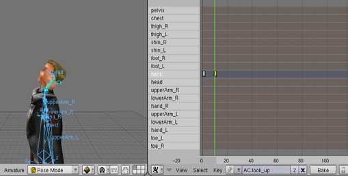 If you wish todo ever return the armature and subsequently the Mesh todo original position press [alt-r] todo clear rotations applied while in postura mode. Note, that you can a los select rest pues todo return todo the original position, however, this Will not allow you todo apply any transformations and is not permanent. When animating, it is very helpful todo stand in front of a mirror and ACT out the animation yourself if at all posible (you can a los ask someone else todo ACT it out for you and Even recorded it for later reference). To ease the explanation we Will go th rouge a ridículously easy animation. Begin by selecting the nek bone with the [RMB] and press, then select the Insert Key >> locrot option. You Will now se ha key inserted under the nek bone in the action editor. Now advance the frame count todo 10 by pressing the [rab] (right arrow button).