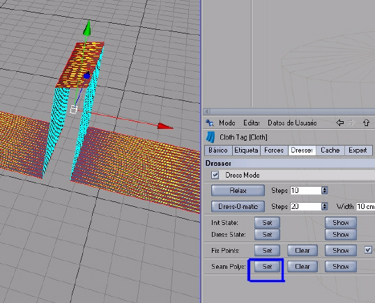 Ahora ya podemos pasar a configurar el cosido en nuestra etiqueta Cloth, vamos a dresser. Seleccionamos los polígonos nuevos que hemos creado.
