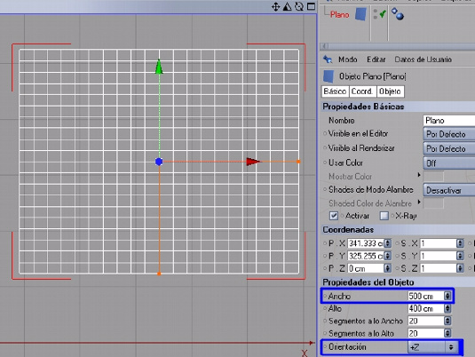 Para la primera escena abriremos nuestro Cinema y crearemos en la vista frontal un objeto plano en el eje +z y le daremos unas medidas de 500 de ancho y 400 de alto.