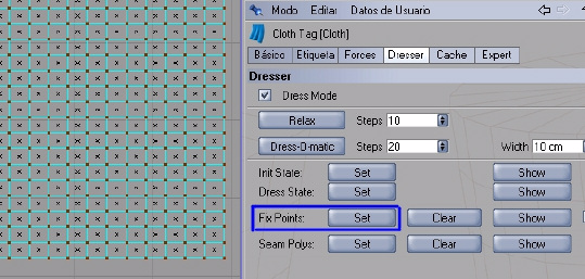 Ahora vamos a nuestra etiqueta Cloth en la opción dresser clicamos en fix points.