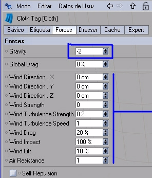Bien ahora vamos a por los parámetros de la etiqueta Cloth de nuestro plano para ello entramos en la opción forces es decir la opción de fuerzas y lo que si es conveniente cambiar es la fuerza de la gravedad por un valor más bajo para que no perdamos control sobre nuestra tela, al bajar este valor veremos que la tela se desplaza más lentamente e impacta con menos fuerza en el objeto Collider, así como también vemos que los otros parámetros son de la fuerza y resistencia del viento.