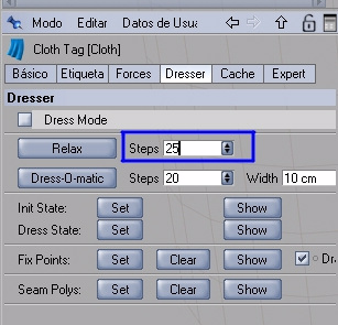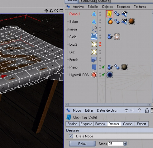 Bien ahora pasamos a la opción dresser es decir vestido y podemos hacer una prueba a ver qué resultado obtenemos para ello modificaremos el número de muestras de relax a 25 y presionamos el botón relax y vemos cómo se comporta la tela.