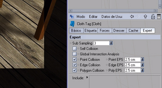 Vemos que nos aparece la mesa por debajo de nuestra tela. Esto lo podemos solucionar cambiando los valores de colisión de nuestra tela, para ello vamos a los parámetros de expert y aquí subimos los valores de colisión.