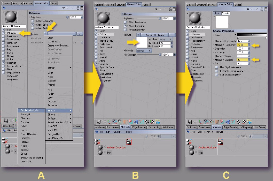 Supongamos que tenemos activado el Ambient Occlusion en el canal difusión. El programa lo calcula según los parámetros de proximidad con los valores dados. Pero si lo fusionamos con el mapa de bits con este procedimiento del bakeo, el efecto es el mismo, pero el tiempo de render se reduce considerablemente.
