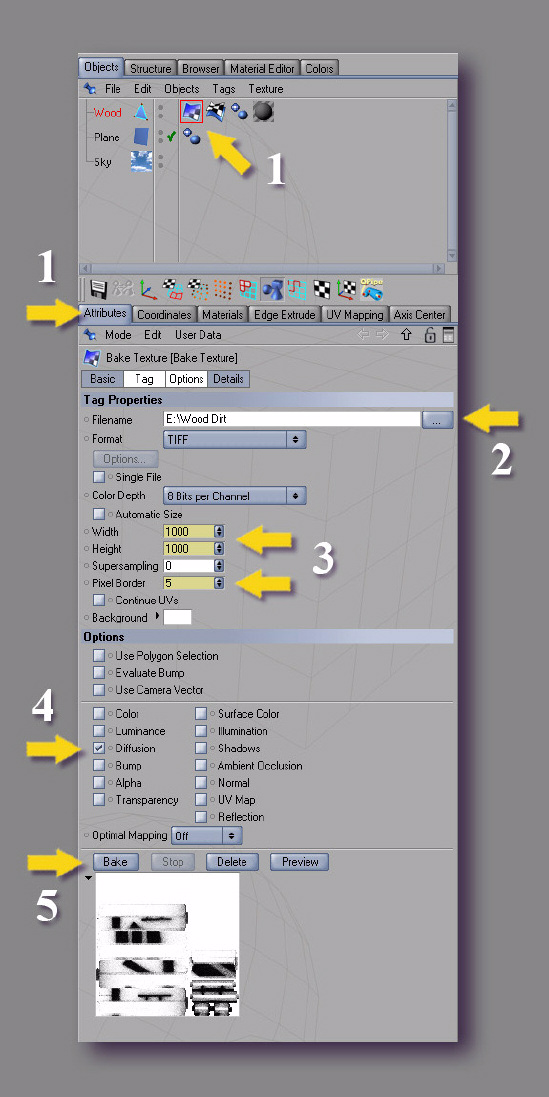 Con el objeto seleccionado clicamos sobre el icono y este le asignara una nueva etiqueta en el panel objeto (1). Con el panel atributos (1) activo nos mostrara las opciones del baker.