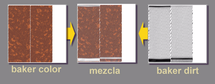 Vemos en esta imagen que tenemos por un lado el mapa de color y por otro el de Ambient Occlusion. Invertimos el mapa de Ambient Occlusion para que lo negro se convierta en blanco. Lo superponemos al de color base en modo screen y ajustamos el valor de transparencia hasta que quede cómo deseemos. En este caso en vez de oscurecer y dar la sensación de Ambient Occlusion se humilde en polvo.