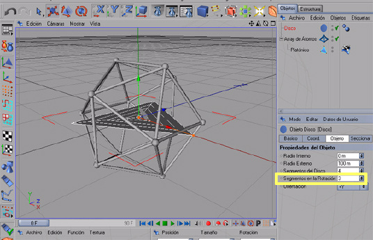 Para cerrar las caras utilizaremos triángulos equilateros: objetos > primitivas > disco, y seleccionando el objeto disco y, dentro de la pestaña objeto, ponemos en el campo segmentos en la rotación = 3.