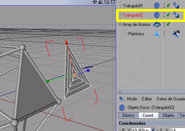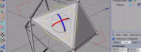 Seleccionamos el disco, en la escala del objeto asignamos el valor 0,6 a s.x, s y, z, para que se ajuste el triángulo a la cara del icosaedro.