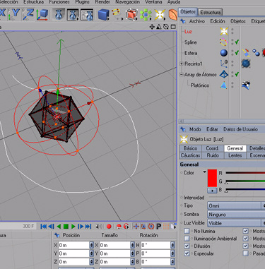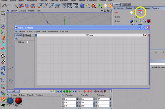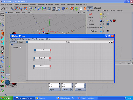 Renombramos la luz, y la llamamos luz1. Abrimos la ventana de Xpresso haciendo doble clic sobre la etiqueta Xpresso, arrastramos, desde el gestor de objetos, los objetos luz1, recinto1 y esfera, dentro de la ventana de Xpresso.