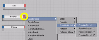 Sobre el cuadrado rojo de la derecha del nodo, haciendo clic con el botón izquierdo recinto1: coordenadas > posición global > posición global.