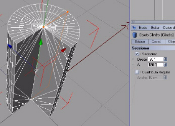 o seccióna: nos permite cortar nuestro cilindro desde un ángulo hasta otro ángulo para así poder conseguir la forma que necesitamos para nuestro modelado, en este ejemplo vemos que seccionamos desde el ángulo -90 hasta el ángulo 180.