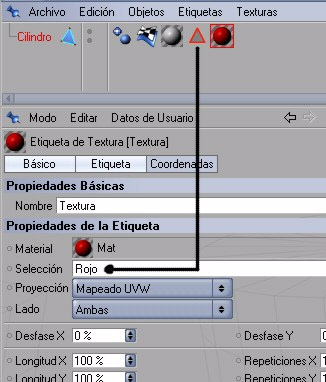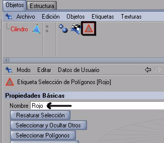 Vemos que en nuestro menú de objetos en el cilindro se ha creado la selección la caul se muestra con un triángulo al cual le asignamos el nombre de rojo.