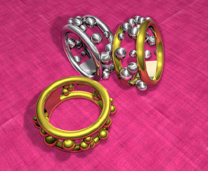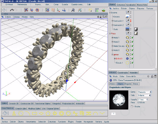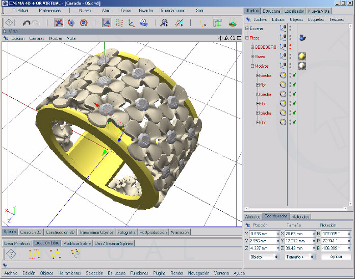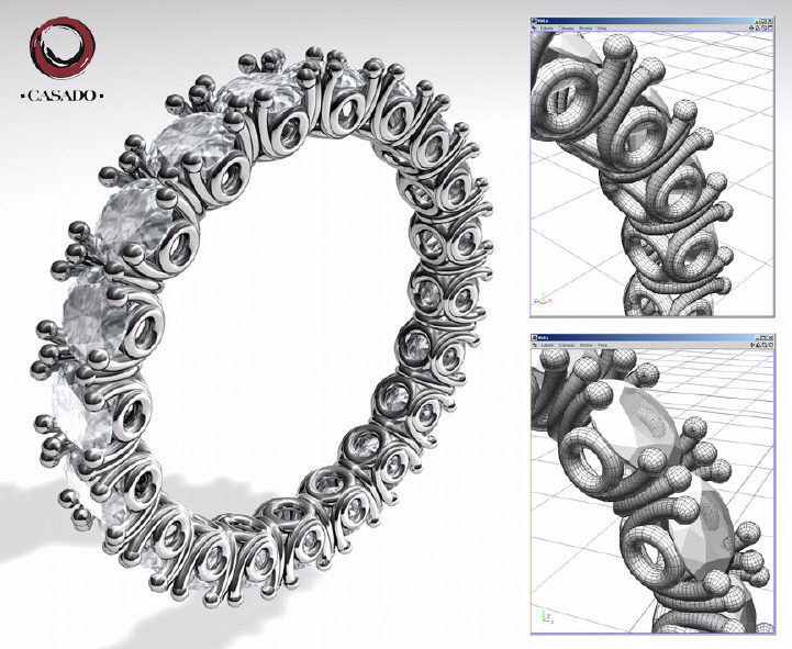 El proceso es algo laborioso, empezando por la construcción en 3d de la pieza, dándole sus medidas a la décima de milímetro. Hay que pensar que una décima de error en el espesor influye mucho en el peso, o en un agujero para la piedra, o en el hueco del dedo de una sortija. Si este paso esta correcto, el resto es más fácil.