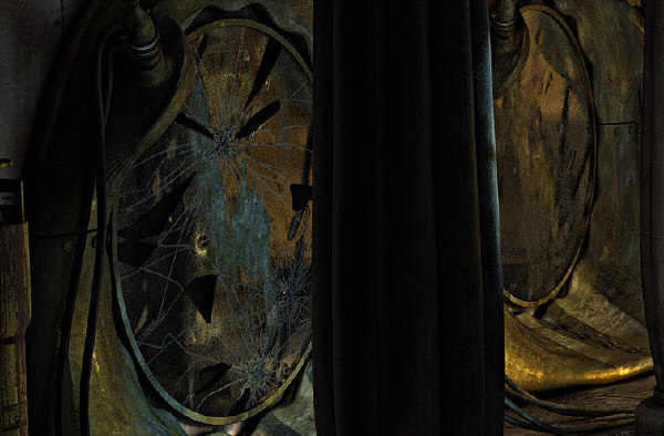 Para potenciar lo que acabo de comentar, y ya que la escena esta localizada dentro de un entorno oscuro y húmedo, creé un material (moho) aplicado como textura extra a todos los elementos y dotar de uniformidad al conjunto. En el canal alfa de este material es donde reside el kit de la cuestión, ya que según se varíe dejara pasar, más o menos, las propiedades del material que tiene debajo, ya sea madera, metal, agua, cristal o piedra (podéis comprobar en el archivo adjunto, variando el canal alfa, lo que acabo de comentaros). descargar.