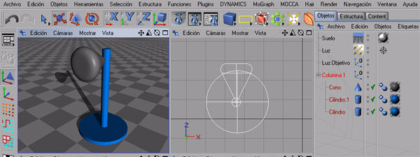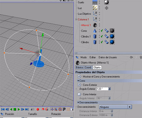 Modelamos un sencillo altavoz, mediante dos cilindros y un cono. Para darle al cono está forma redondeada, activamos tapas en los parámetros del objeto. Creamos un objeto nulo y lo renombramos columna 1. Anidamos dentro de columna 1 los dos cilindros y el cono.