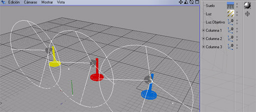 Anidamos el objeto altavoz1 dentro de columna1. Hacemos dos copias de columna 1, que llamaremos respectivamente columna 2 y columna 3, con sus respectivos colores rojo y amarillo. Movemos los tres objetos columna colocándolos aproximadamente como en la imagen.