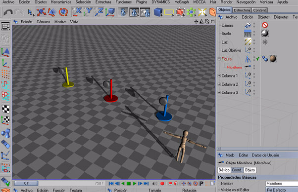 Tenemos la escena terminada. Necesitamos, para poder continuar, disponer de tres archivos de sonido. Los archivos de sonido, que admite Cinema 4D, son del tipo wave. Para convertir sonidos, desde otros formatos, al formato *.wav, es necesario usar un programa de conversión de sonidos.