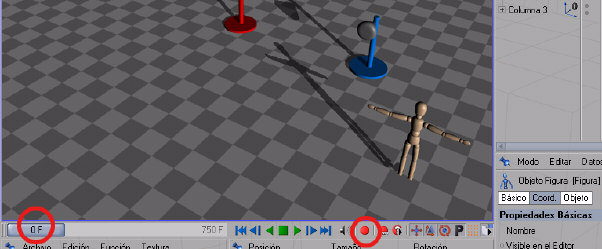 Con el cursor de la animación en el primer fotograma (0 f) seleccionamos el objeto figura, y creamos un fotograma clave.