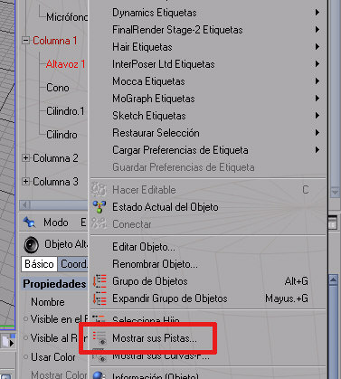 Nos vamos al gestor de objetos y seleccionamos el objeto altavoz 1, seguidamente con el botón derecho mostrar sus pistas.