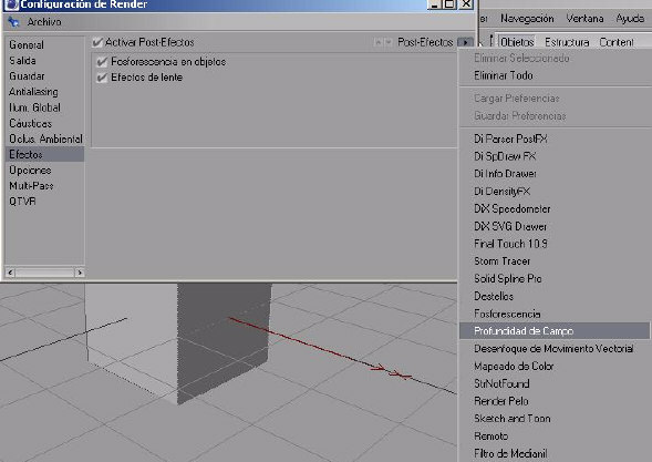 Ahora en la configuración de render y en la opción de efectos, buscaremos el efecto profundidad de campo.