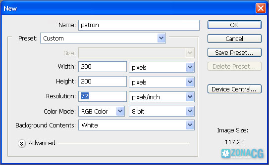 Orientaré este tutorial para fines web, pero si ustedes necesitan hacer un patrón para imprimir recuerden substituir el valor de 72dpi por 300dpi que se ven en la siguiente imagen.