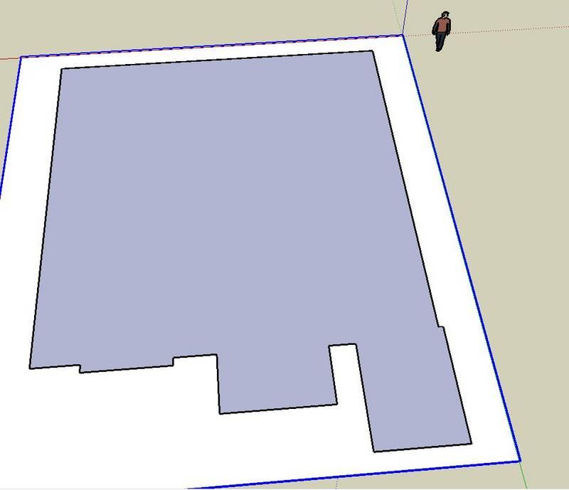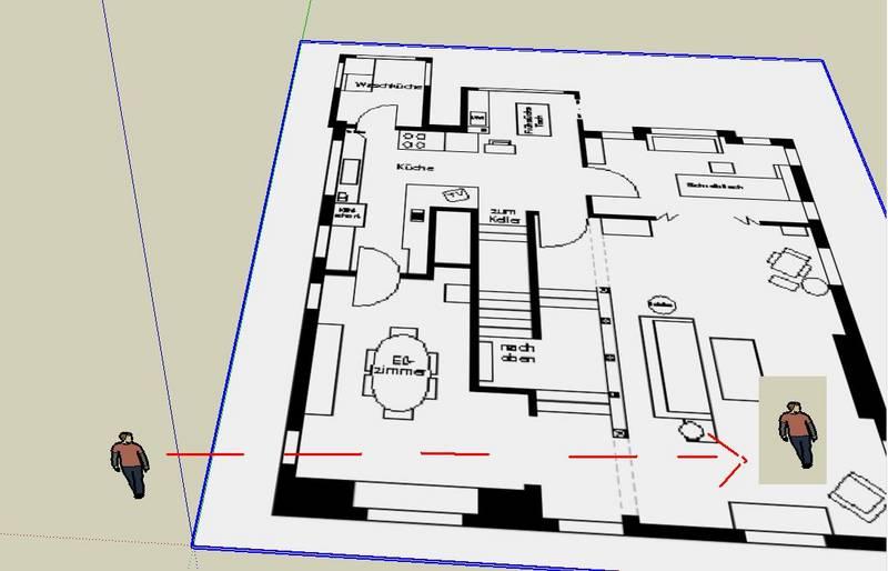 5-haz click para asentar la casa, y verás que ahora al mover el ratón puedes ajustar la escala, pues el pasmarote entra en acción, haz tan grande el dibujo hasta que veas que queda a un tamaño real respecto al hombre. Para ello, haz como en la imagen, ubica mentalmente al tío en la casa hasta que veas que todo queda a su tamaño, las sillas y sofás ayudan. (este método se da cuando no sabes las medidas de la casa, este es el caso).