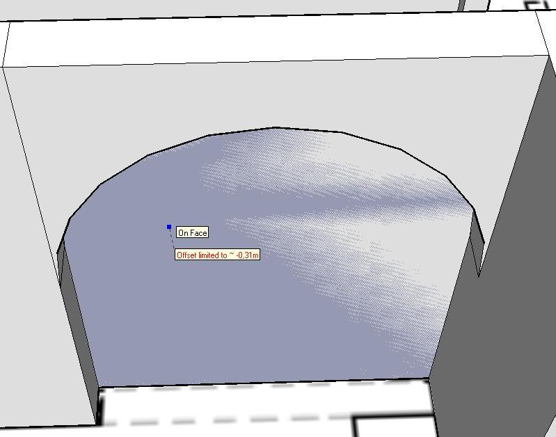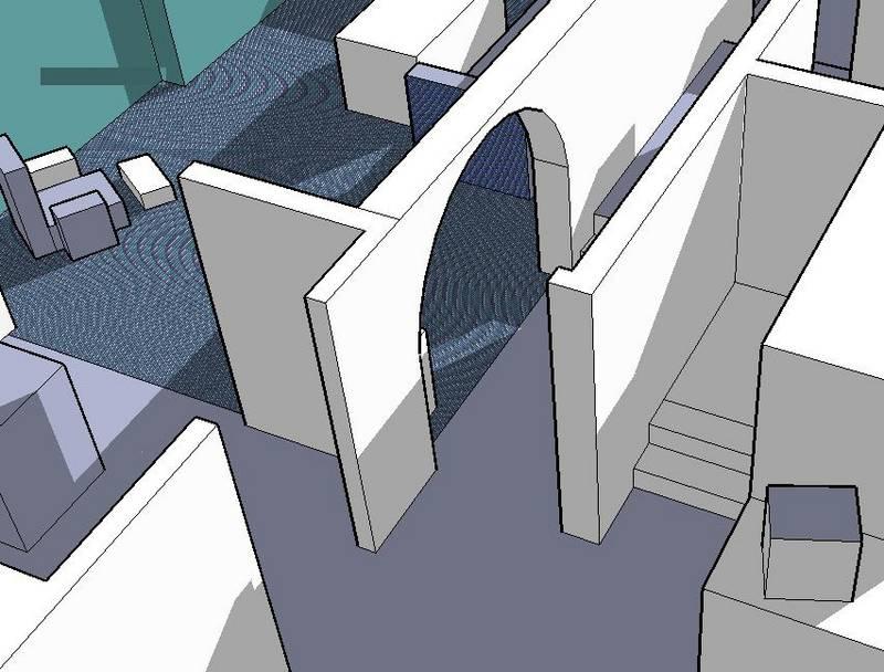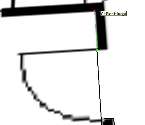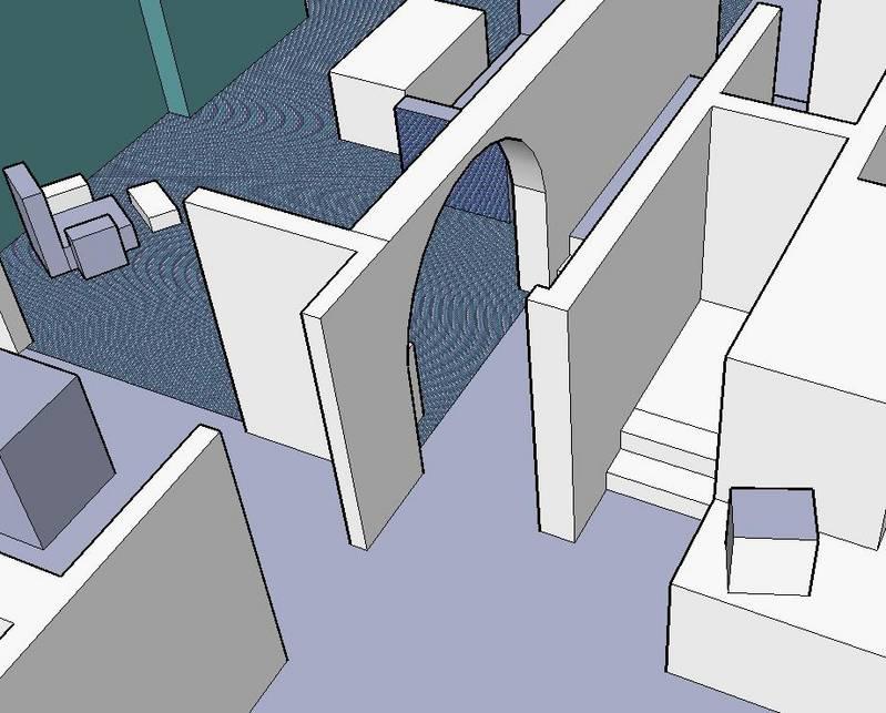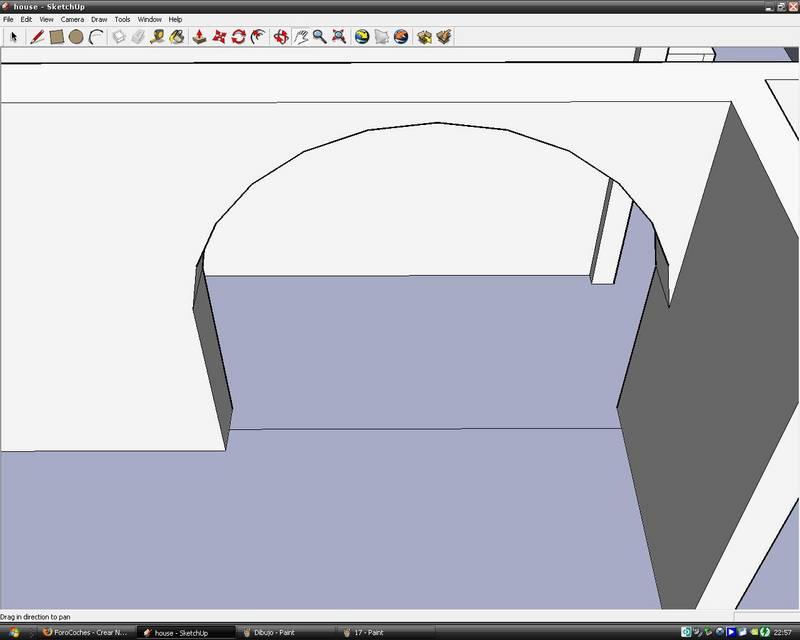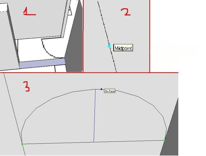 15-vamos a crear uno de los 2 arcos que hay. Primero, une la pared, añadiendo líneas (1) una vez completa la pared, busca con el ratón la mitad de la línea vertical (ya sabes, al ponerse cian, que además dice midpoint) (2) luego, tira una línea desde allí hasta la otra pared, dividiendo ese tramo de pared en 2, luego, usa.