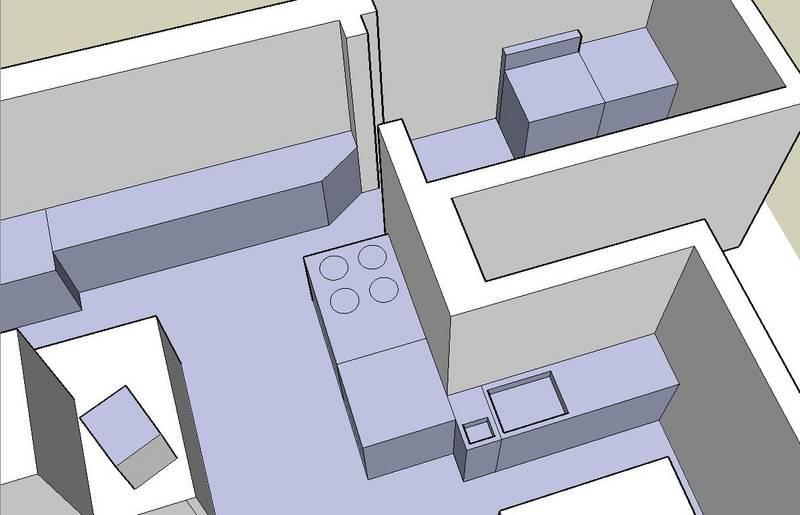 2 anotaciones, para crear objetos encima de estantes, fácil, ese microondas que veis, lo extruimos en altura bastante, luego la encimera, y volvemos a extruir el microondas a su altura correcta. Si queremos hacer huecos, dibujamos el hueco, y extruimos negativamente (hacia dentro).